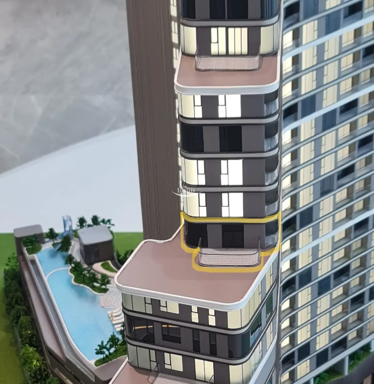 Aquarous Jomtien Pattaya presents a distinctive one-bedroom condo on the 20th floor, featuring a spacious balcony with stunning sea views.