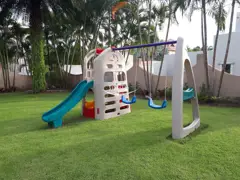 A secure, gated community-run village with 24-hour monitored guarding, wide roads, and a huge central communal recreation area.